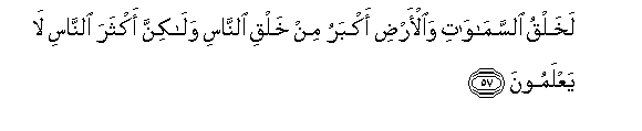 57. Lakhalqu alssamawati waal-ardi akbaru min khalqi alnnasi walakinna akthara alnnasi la yaAAlamoona