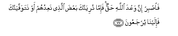 77. Faisbir inna waAAda Allahi haqqun fa-imma nuriyannaka baAAda allathee naAAiduhum aw natawaffayannaka fa-ilayna yurjaAAoona