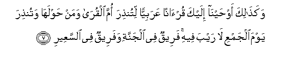 7. Wakathalika awhayna ilayka qur-anan AAarabiyyan litunthira omma alqura waman hawlaha watunthira yawma aljamAAi la rayba feehi fareequn fee aljannati wafareequn fee alssaAAeeri