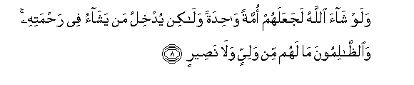 8. Walaw shaa Allahu lajaAAalahum ommatan wahidatan walakin yudkhilu man yashao fee rahmatihi waalththalimoona ma lahum min waliyyin wala naseerin