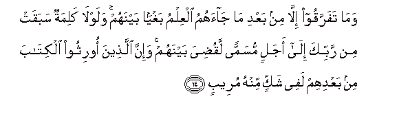 14. Wama tafarraqoo illa min baAAdi ma jaahumu alAAilmu baghyan baynahum walawla kalimatun sabaqat min rabbika ila ajalin musamman laqudiya baynahum wa-inna allatheena oorithoo alkitaba min baAAdihim lafee shakkin minhu mureebin
