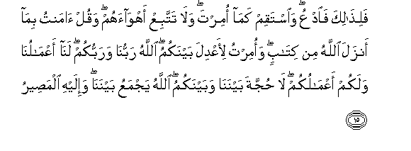 15. Falithalika faodAAu waistaqim kama omirta wala tattabiAA ahwaahum waqul amantu bima anzala Allahu min kitabin waomirtu li-aAAdila baynakum Allahu rabbuna warabbukum lana aAAmaluna walakum aAAmalukum la hujjata baynana wabaynakumu Allahu yajmaAAu baynana wa-ilayhi almaseeru