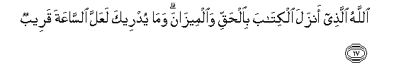 17. Allahu allathee anzala alkitaba bialhaqqi waalmeezani wama yudreeka laAAalla alssaAAata qareebun