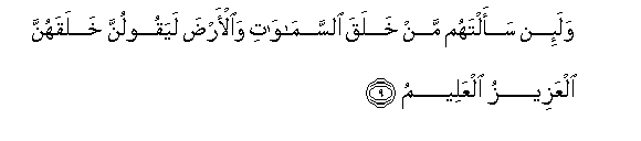 9. Wala-in saaltahum man khalaqa alssamawati waal-arda layaqoolunna khalaqahunna alAAazeezu alAAaleemu