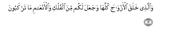 12. Waallathee khalaqa al-azwaja kullaha wajaAAala lakum mina alfulki waal-anAAami ma tarkaboona
