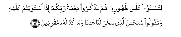 13. Litastawoo AAala thuhoorihi thumma tathkuroo niAAmata rabbikum itha istawaytum AAalayhi wataqooloo subhana allathee sakhkhara lana hatha wama kunna lahu muqrineena