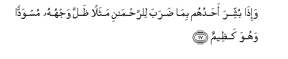 17. Wa-itha bushshira ahaduhum bima daraba lilrrahmani mathalan thalla wajhuhu muswaddan wahuwa katheemun