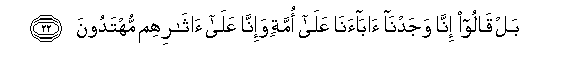 22. Bal qaloo inna wajadna abaana AAala ommatin wa-inna AAala atharihim muhtadoona