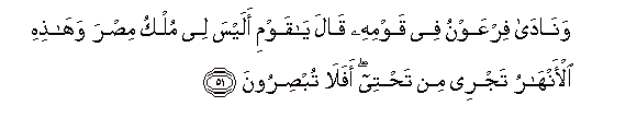 51. Wanada firAAawnu fee qawmihi qala ya qawmi alaysa lee mulku misra wahathihi al-anharu tajree min tahtee afala tubsiroona