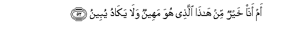 52. Am ana khayrun min hatha allathee huwa maheenun wala yakadu yubeenu