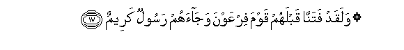 17. Walaqad fatanna qablahum qawma firAAawna wajaahum rasoolun kareemun