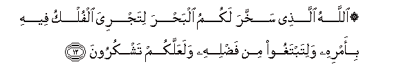 12. Allahu allathee sakhkhara lakumu albahra litajriya alfulku feehi bi-amrihi walitabtaghoo min fadlihi walaAAallakum tashkuroona