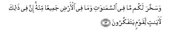 13. Wasakhkhara lakum ma fee alssamawati wama fee al-ardi jameeAAan minhu inna fee thalika laayatin liqawmin yatafakkaroona