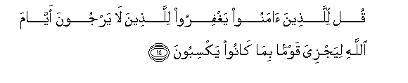 14. Qul lillatheena amanoo yaghfiroo lillatheena la yarjoona ayyama Allahi liyajziya qawman bima kanoo yaksiboona