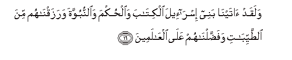 16. Walaqad atayna banee isra-eela alkitaba waalhukma waalnnubuwwata warazaqnahum mina alttayyibati wafaddalnahum AAala alAAalameena