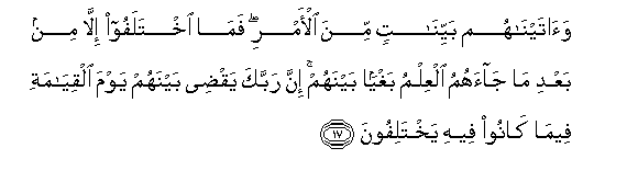 17. Waataynahum bayyinatin mina al-amri fama ikhtalafoo illa min baAAdi ma jaahumu alAAilmu baghyan baynahum inna rabbaka yaqdee baynahum yawma alqiyamati feema kanoo feehi yakhtalifoona