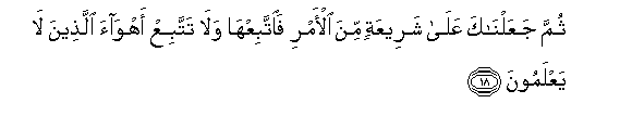18. Then We put thee on the (right) Way of Religion: so follow thou that (Way), and follow not the desires of those who know not.