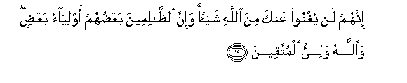 19. Innahum lan yughnoo AAanka mina Allahi shay-an wa-inna alththalimeena baAAduhum awliyao baAAdin waAllahu waliyyu almuttaqeena