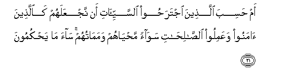 21. Am hasiba allatheena ijtarahoo alssayyi-ati an najAAalahum kaallatheena amanoo waAAamiloo alssalihati sawaan mahyahum wamamatuhum saa ma yahkumoona