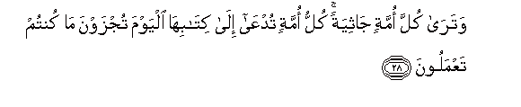 28. Watara kulla ommatin jathiyatan kullu ommatin tudAAa ila kitabiha alyawma tujzawna ma kuntum taAAmaloona