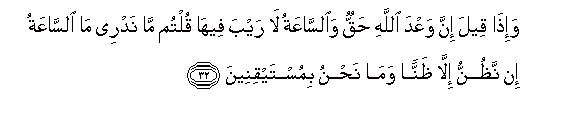 32. "And when it was said that the promise of Allah was true, and that the Hour- there was no doubt about its (coming), ye used to say, 'We know not what is the hour: we only think it is an idea, and we have no firm assurance.'"