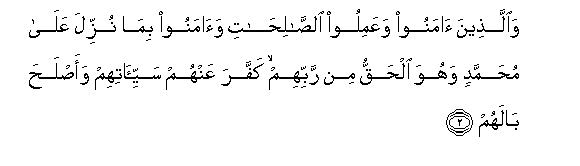 2. Waallatheena amanoo waAAamiloo alssalihati waamanoo bima nuzzila AAala muhammadin wahuwa alhaqqu min rabbihim kaffara AAanhum sayyi-atihim waaslaha balahum