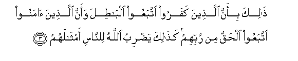 3. Thalika bi-anna allatheena kafaroo ittabaAAoo albatila waanna allatheena amanoo ittabaAAoo alhaqqa min rabbihim kathalika yadribu Allahu lilnnasi amthalahum