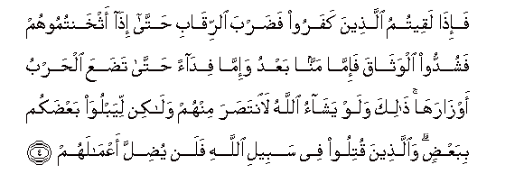 4. Fa-itha laqeetumu allatheena kafaroo fadarba alrriqabi hatta itha athkhantumoohum fashuddoo alwathaqa fa-imma mannan baAAdu wa-imma fidaan hatta tadaAAa alharbu awzaraha thalika walaw yashao Allahu laintasara minhum walakin liyabluwa baAAdakum bibaAAdin waallatheena qutiloo fee sabeeli Allahi falan yudilla aAAmalahum