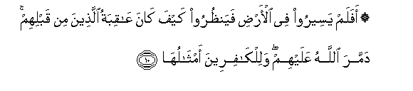 10. Afalam yaseeroo fee al-ardi fayanthuroo kayfa kana AAaqibatu allatheena min qablihim dammara Allahu AAalayhim walilkafireena amthaluha