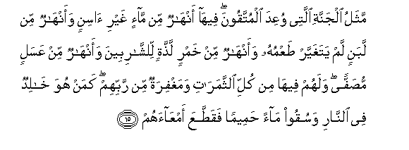 15. Mathalu aljannati allatee wuAAida almuttaqoona feeha anharun min ma-in ghayri asinin waanharun min labanin lam yataghayyar taAAmuhu waanharun min khamrin laththatin lilshsharibeena waanharun min AAasalin musaffan walahum feeha min kulli alththamarati wamaghfiratun min rabbihim kaman huwa khalidun fee alnnari wasuqoo maan hameeman faqattaAAa amAAaahum