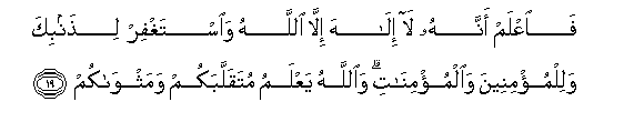 19. FaiAAlam annahu la ilaha illa Allahu waistaghfir lithanbika walilmu/mineena waalmu/minati waAllahu yaAAlamu mutaqallabakum wamathwakum
