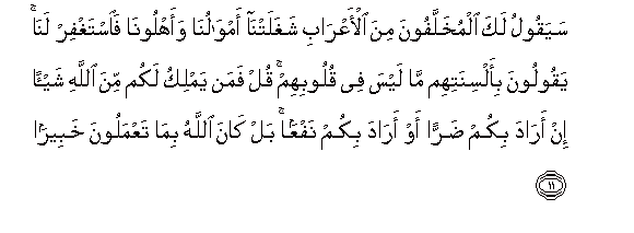 11. Sayaqoolu laka almukhallafoona mina al-aAArabi shaghalatna amwaluna waahloona faistaghfir lana yaqooloona bi-alsinatihim ma laysa fee quloobihim qul faman yamliku lakum mina Allahi shay-an in arada bikum darran aw arada bikum nafAAan bal kana Allahu bima taAAmaloona khabeeran