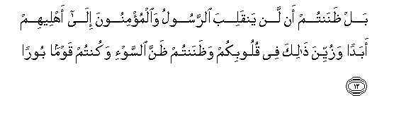 12. Bal thanantum an lan yanqaliba alrrasoolu waalmu/minoona ila ahleehim abadan wazuyyina thalika fee quloobikum wathanantum thanna alssaw-i wakuntum qawman booran