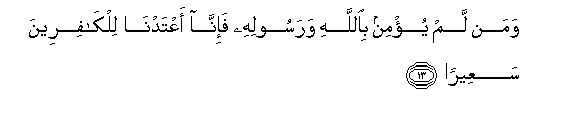 13. Waman lam yu/min biAllahi warasoolihi fa-inna aAAtadna lilkafireena saAAeeran