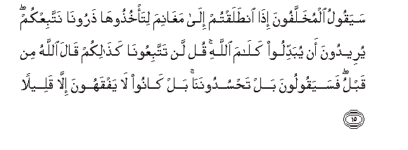15. Sayaqoolu almukhallafoona itha intalaqtum ila maghanima lita/khuthooha tharoona nattabiAAkum yureedoona an yubaddiloo kalama Allahi qul lan tattabiAAoona kathalikum qala Allahu min qablu fasayaqooloona bal tahsudoonana bal kanoo la yafqahoona illa qaleelan