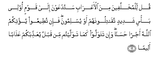 16. Qul lilmukhallafeena mina al-aAArabi satudAAawna ila qawmin olee ba/sin shadeedin tuqatiloonahum aw yuslimoona fa-in tuteeAAoo yu/tikumu Allahu ajran hasanan wa-in tatawallaw kama tawallaytum min qablu yuAAaththibkum AAathaban aleeman