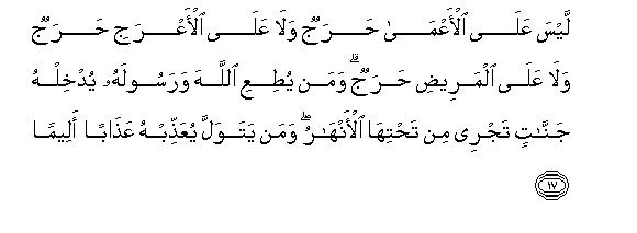 17. Laysa AAala al-aAAma harajun wala AAala al-aAAraji harajun wala AAala almareedi harajun waman yutiAAi Allaha warasoolahu yudkhilhu jannatin tajree min tahtiha al-anharu waman yatawalla yuAAaththibhu AAathaban aleeman