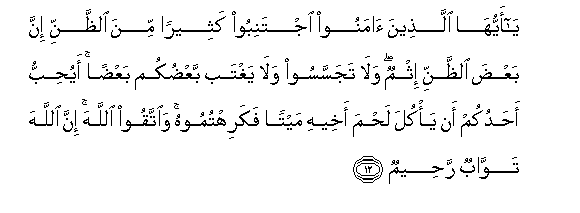 12. Ya ayyuha allatheena amanoo ijtaniboo katheeran mina alththanni inna baAAda alththanni ithmun wala tajassasoo wala yaghtab baAAdukum baAAdan ayuhibbu ahadukum an ya/kula lahma akheehi maytan fakarihtumoohu waittaqoo Allaha inna Allaha tawwabun raheemun