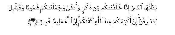 13. Ya ayyuha alnnasu inna khalaqnakum min thakarin waontha wajaAAalnakum shuAAooban waqaba-ila litaAAarafoo inna akramakum AAinda Allahi atqakum inna Allaha AAaleemun khabeerun