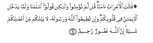 14. Qalati al-aAArabu amanna qul lam tu/minoo walakin qooloo aslamna walamma yadkhuli al-eemanu fee quloobikum wa-in tuteeAAoo Allaha warasoolahu la yalitkum min aAAmalikum shay-an inna Allaha ghafoorun raheemun