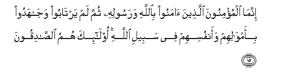 15. Innama almu/minoona allatheena amanoo biAllahi warasoolihi thumma lam yartaboo wajahadoo bi-amwalihim waanfusihim fee sabeeli Allahi ola-ika humu alssadiqoona