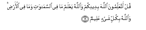 16. Qul atuAAallimoona Allaha bideenikum waAllahu yaAAlamu ma fee alssamawati wama fee al-ardi waAllahu bikulli shay-in AAaleemun