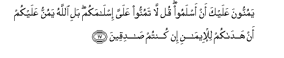 17. Yamunnoona AAalayka an aslamoo qul la tamunnoo AAalayya islamakum bali Allahu yamunnu AAalaykum an hadakum lil-eemani in kuntum sadiqeena