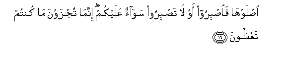 16. "Burn ye therein: the same is it to you whether ye bear it with patience, or not: Ye but receive the recompense of your (own) deeds."