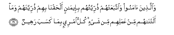21. Waallatheena amanoo waittabaAAat-hum thurriyyatuhum bi-eemanin alhaqna bihim thurriyyatahum wama alatnahum min AAamalihim min shay-in kullu imri-in bima kasaba raheenun