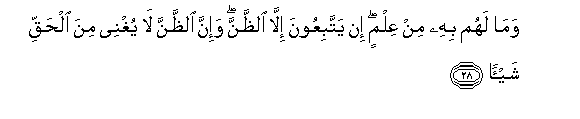 28. Wama lahum bihi min AAilmin in yattabiAAoona illa alththanna wa-inna alththanna la yughnee mina alhaqqi shay-an