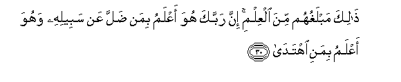 30. Thalika mablaghuhum mina alAAilmi inna rabbaka huwa aAAlamu biman dalla AAan sabeelihi wahuwa aAAlamu bimani ihtada