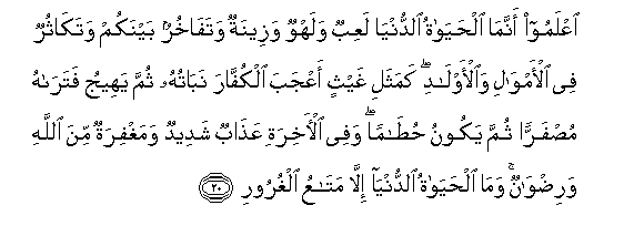 20. IAAlamoo annama alhayatu alddunya laAAibun walahwun wazeenatun watafakhurun baynakum watakathurun fee al-amwali waal-awladi kamathali ghaythin aAAjaba alkuffara nabatuhu thumma yaheeju fatarahu musfarran thumma yakoonu hutaman wafee al-akhirati AAathabun shadeedun wamaghfiratun mina Allahi waridwanun wama alhayatu alddunya illa mataAAu alghuroori