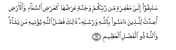 21. Sabiqoo ila maghfiratin min rabbikum wajannatin AAarduha kaAAardi alssama-i waal-ardi oAAiddat lillatheena amanoo biAllahi warusulihi thalika fadlu Allahi yu/teehi man yashao waAllahu thoo alfadli alAAatheemi