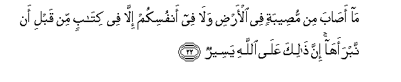 22. Ma asaba min museebatin fee al-ardi wala fee anfusikum illa fee kitabin min qabli an nabraaha inna thalika AAala Allahi yaseerun